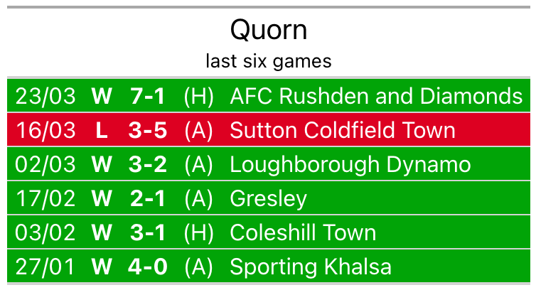 Quorn beat AFC Rushden and Diamonds 7-1 last time out, also on March 23.
