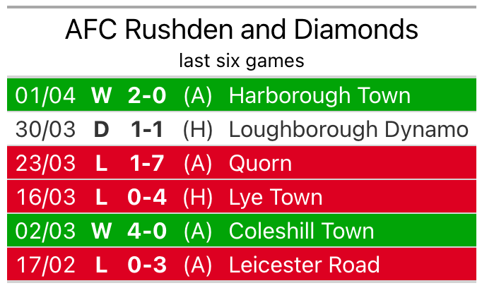 With five wins and one loss over that period, the visitors’ form is much better – they have taken 15 points from 18, compared to Rushden & Diamonds’s seven.