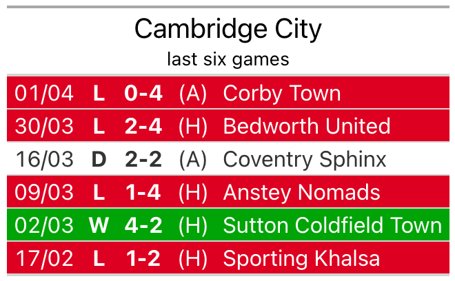 Cambridge City are on a poor run ahead of hosting Boldmere St. Michaels at ProEdge Westwood Road on Saturday, with just four points collected from their last six games.