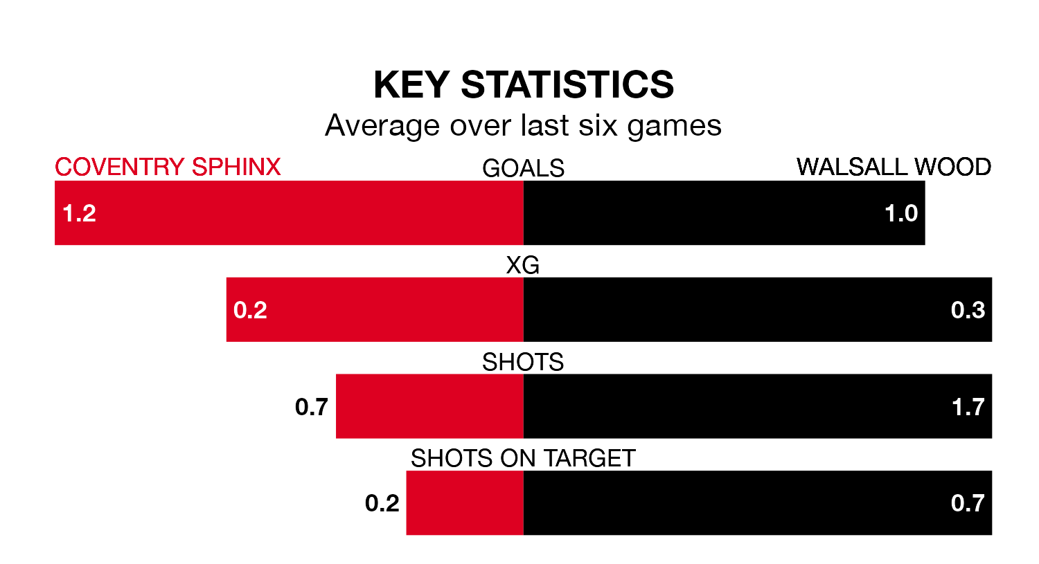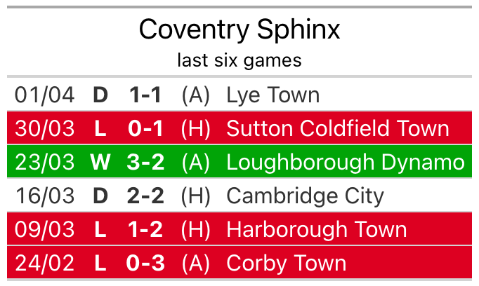 With two wins and a draw over that period, the visitors’ form is slightly better – they have taken seven points from 18, compared to Coventry Sphinx’s five.