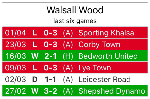 Walsall Wood are five places ahead of the home side in 12th, with 13 wins and six draws putting them on 45 points.