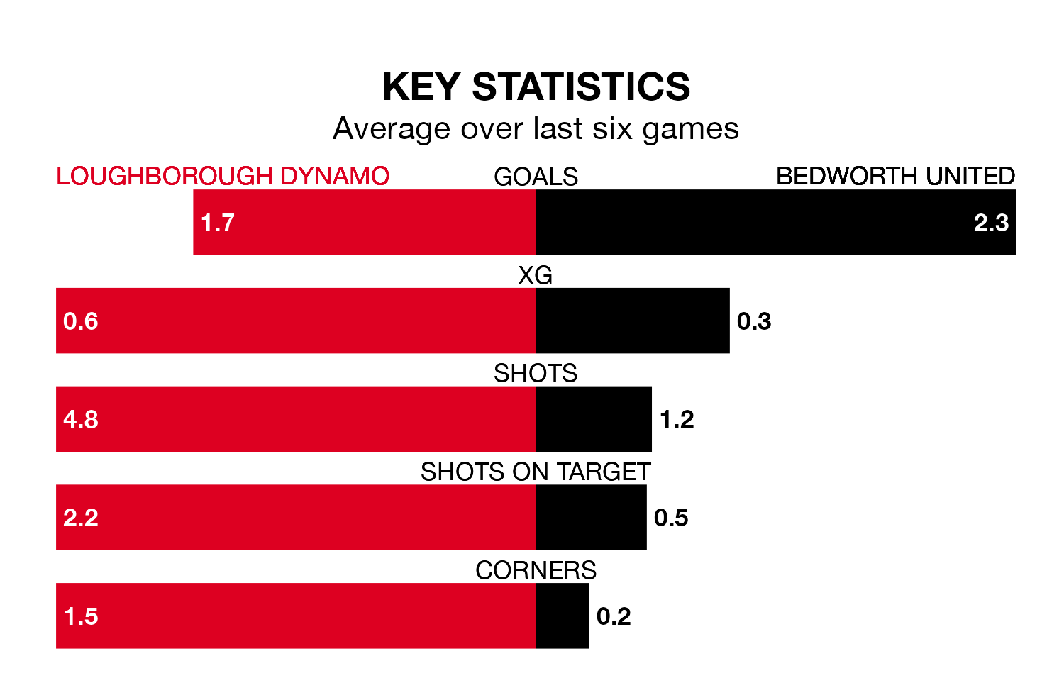 On average, Loughborough Dynamo scored 2.0 goals and Bedworth 1.2 in those matches.