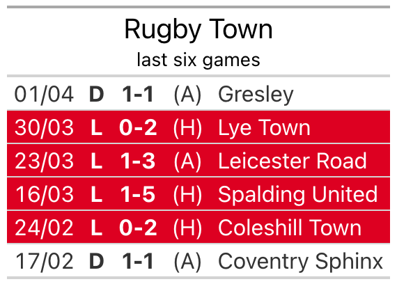 Rugby’s last match was on Monday, a 1-1 draw against Gresley.