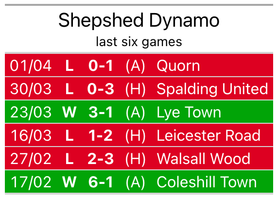 Shepshed Dynamo are four places ahead of Town in 15th, with nine wins and five draws putting them on 32 points.