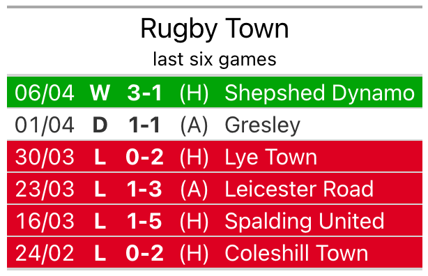 Rugby are in bad form in the Northern Premier League Division One Midlands, with one win and a draw from their last six games.