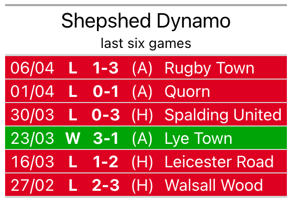 Shepshed Dynamo’s last match was on April 6, a 3-1 loss against Rugby Town.