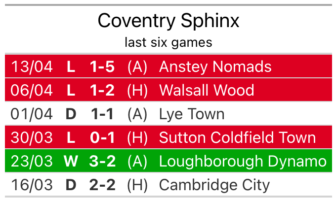 Coventry Sphinx, meanwhile, lost their last match, 5-1 against Anstey Nomads.