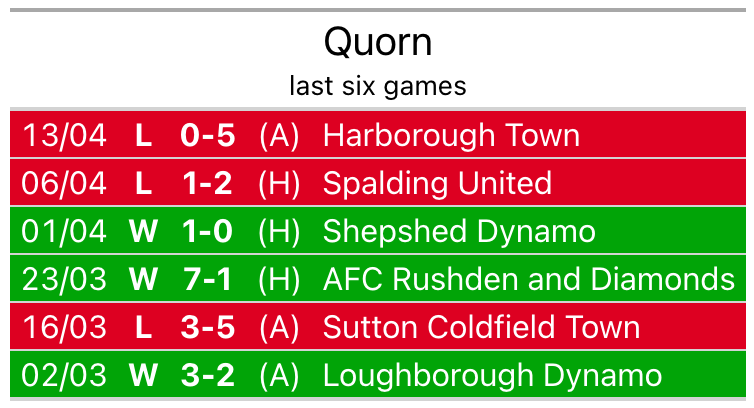 Quorn, meanwhile, lost their last match, 5-0 against Harborough Town.