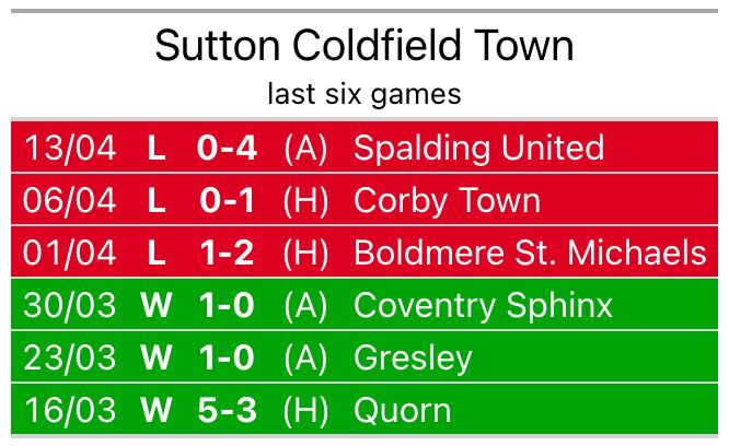 Sutton Coldfield’s last match was on April 13, a 4-0 loss against Spalding United.