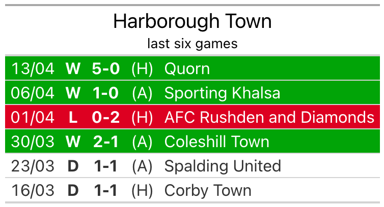 Harborough beat Quorn 5-0 last time out, also on April 13.
