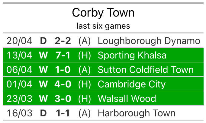 Corby’s last match was on April 20, a 2-2 draw against Loughborough Dynamo.