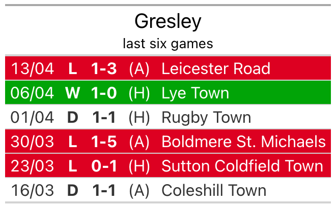 Gresley lost 3-1 against Leicester Road last time out, on April 13.