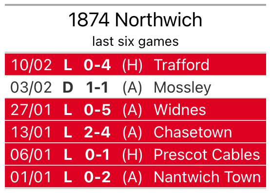 1874 Northwich’s last match was on February 10, a 4-0 loss against Trafford.