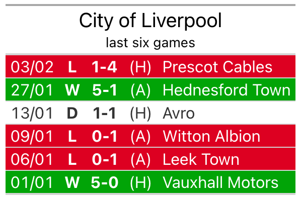 City of Liverpool lost 4-1 against Prescot Cables last time out, on February 3.