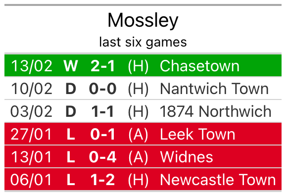 Mossley are four places ahead of Town in 15th, with nine wins and six draws putting them on 33 points.