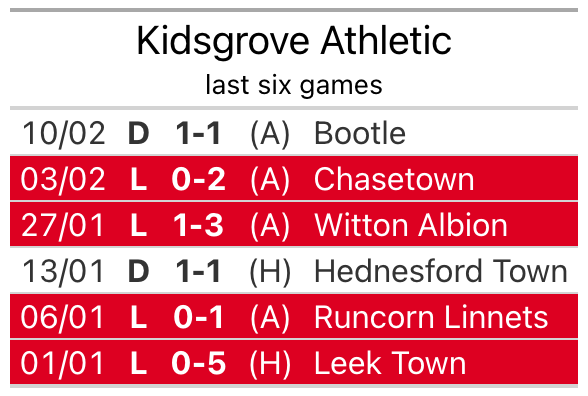 Kidsgrove are in terrible form in the Northern Premier League Division One West, with no wins and two draws from their last six games.