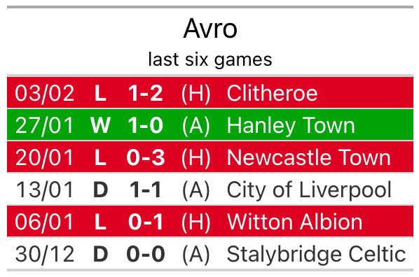 Avro lost 2-1 against Clitheroe last time out, on February 3.