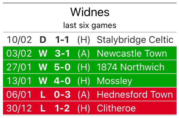 In their last league match, on February 10, Widnes drew with Stalybridge Celtic 1-1 at home.