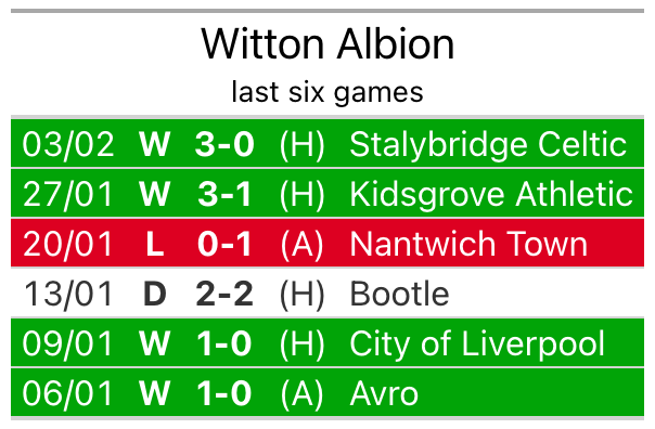 Witton won, 3-0 at home against Stalybridge Celtic on February 3.