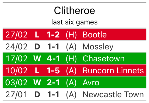 With three wins and a draw over that period, the away side’s form is slightly better – they have taken 10 points from 18, compared to Clitheroe’s eight.