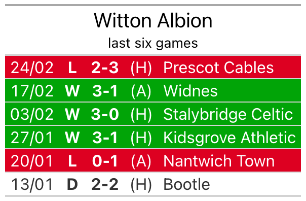 Witton lost 3-2 against Prescot Cables last time out, on February 24.