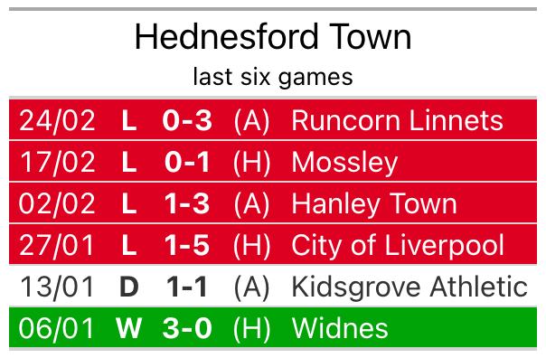 Hednesford are in bad form in the Northern Premier League Division One West, with one win and a draw from their last six games.
