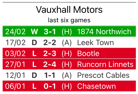 With a win and two draws over that period, Vauxhall Motors’s form is slightly better – they have taken five points from 18, compared to Town’s four.