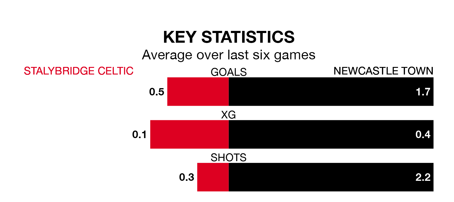 Stalybridge Celtic, meanwhile, are average scorers, with 1.4 goals per game. They have conceded 1.3 goals per game.
