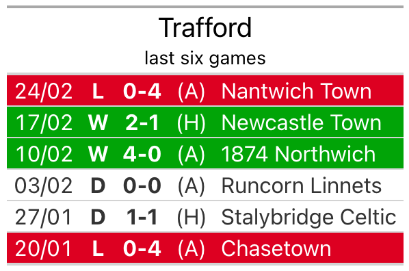 Trafford, meanwhile, lost their last match, 4-0 against Nantwich Town.
