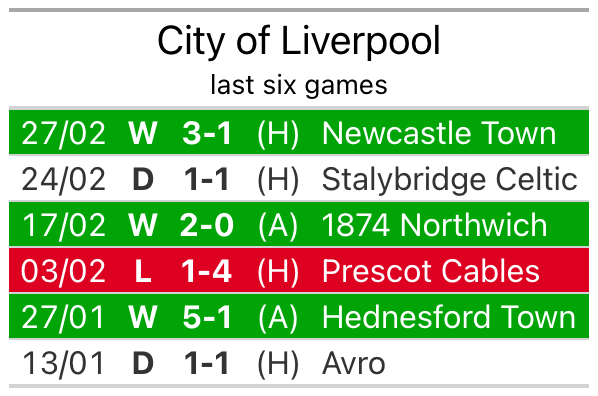 With three wins and two draws over that period, City of Liverpool’s form is better – they have taken 11 points from 18, compared to the home team’s eight.