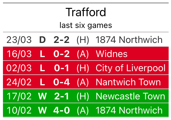 Trafford drew 2-2 with 1874 Northwich last time out, also on Saturday.