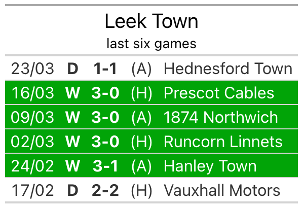 Leek’s last match was on Saturday, a 1-1 draw against Hednesford Town.