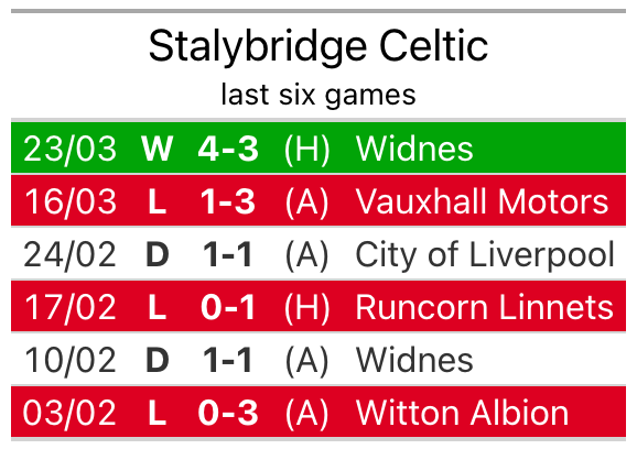Stalybridge Celtic beat Widnes 4-3 last time out, also on Saturday.