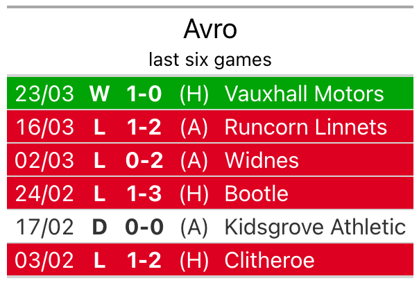 Avro’s last match was on March 23, a 1-0 win against Vauxhall Motors.
