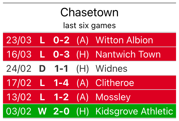 Chasetown have lost four and drawn one matches since they last earned three points – against Kidsgrove Athletic on February 3.