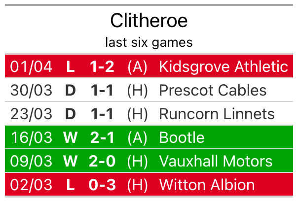 Clitheroe, meanwhile, lost their last match, 2-1 against Kidsgrove Athletic.