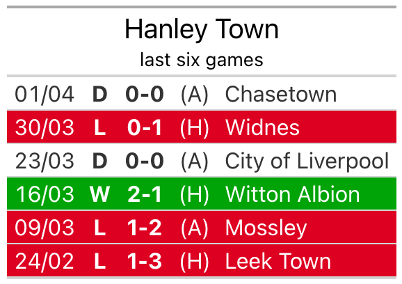 Their last meeting was on November 11, when Hanley won 2-0 at home.