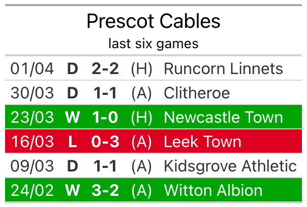 In their last league match, on Monday, Prescot Cables drew with Runcorn Linnets 2-2 at home.