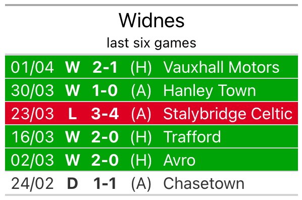 Widnes’s last match was on April 1, a 2-1 win against Vauxhall Motors.