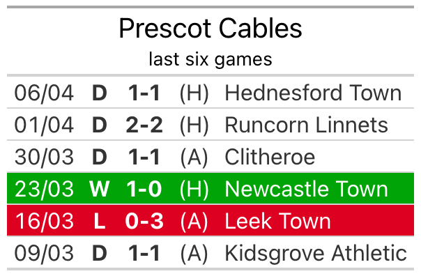 With a win and four draws over that period, Prescot Cables’s form is much worse – they have taken seven points from 18, compared to the home team’s 13.