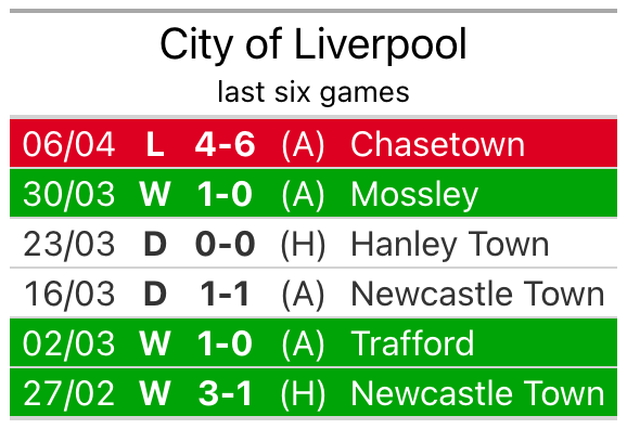 The visitors have won one and drawn one of their last six fixtures, while City of Liverpool have three wins and two draws.