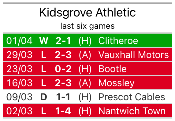Kidsgrove beat Clitheroe 2-1 last time out, on April 1.