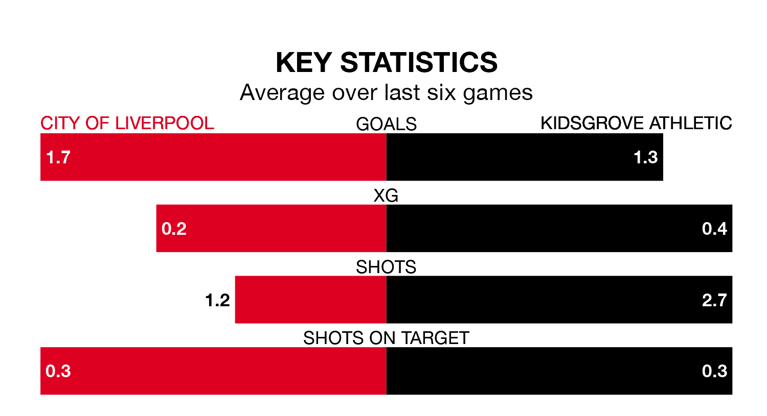 On average, City of Liverpool scored 1.4 goals and Kidsgrove 1.2 in those matches.