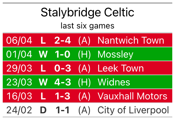 In their last league match, on April 6, Stalybridge Celtic lost to Nantwich Town 4-2 away.