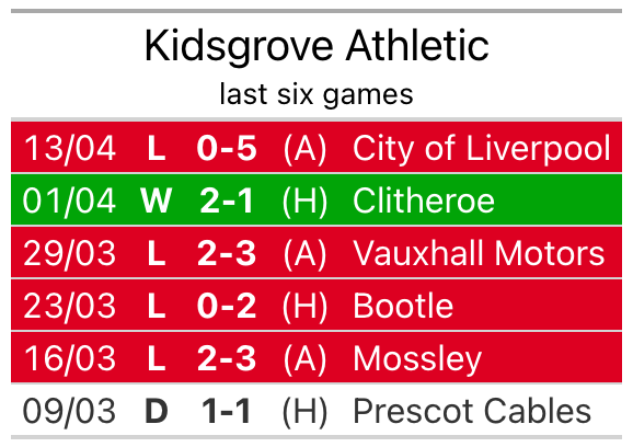 Kidsgrove are one place ahead of the away side in 17th, with 10 wins and nine draws putting them on 39 points.