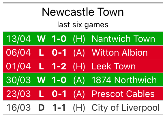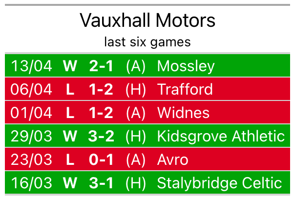In their last league match, on April 13, Vauxhall Motors beat Mossley 2-1 away.