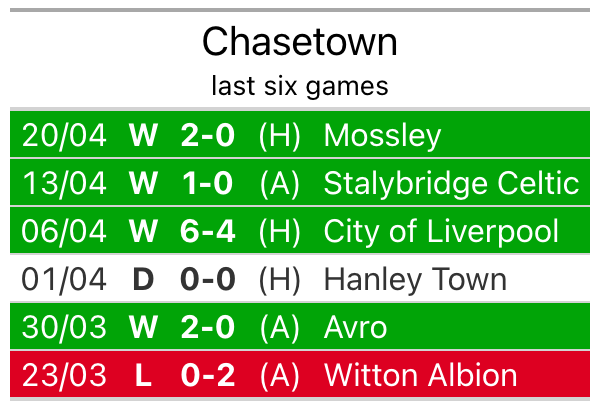 Chasetown beat Mossley 2-0 last time out, also on April 20.