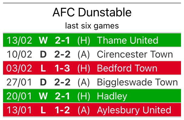 In their last league match, on Tuesday, Dunstable beat Thame United 2-1 at home.