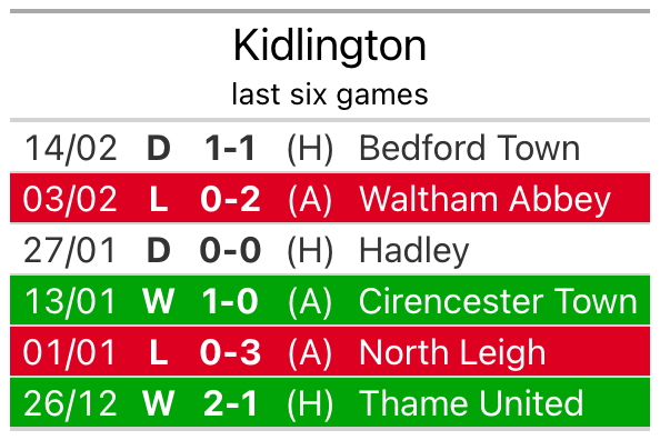 And also with two wins and two draws over that period, Kidlington’s form is identical – they have both taken eight points from 18.