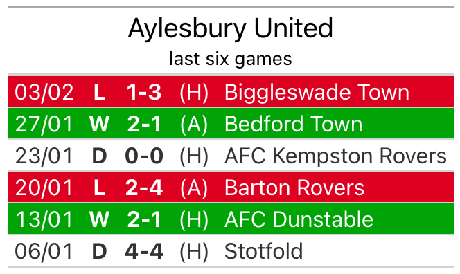 In their last league match, on February 3, Aylesbury lost to Biggleswade Town 3-1 at home.